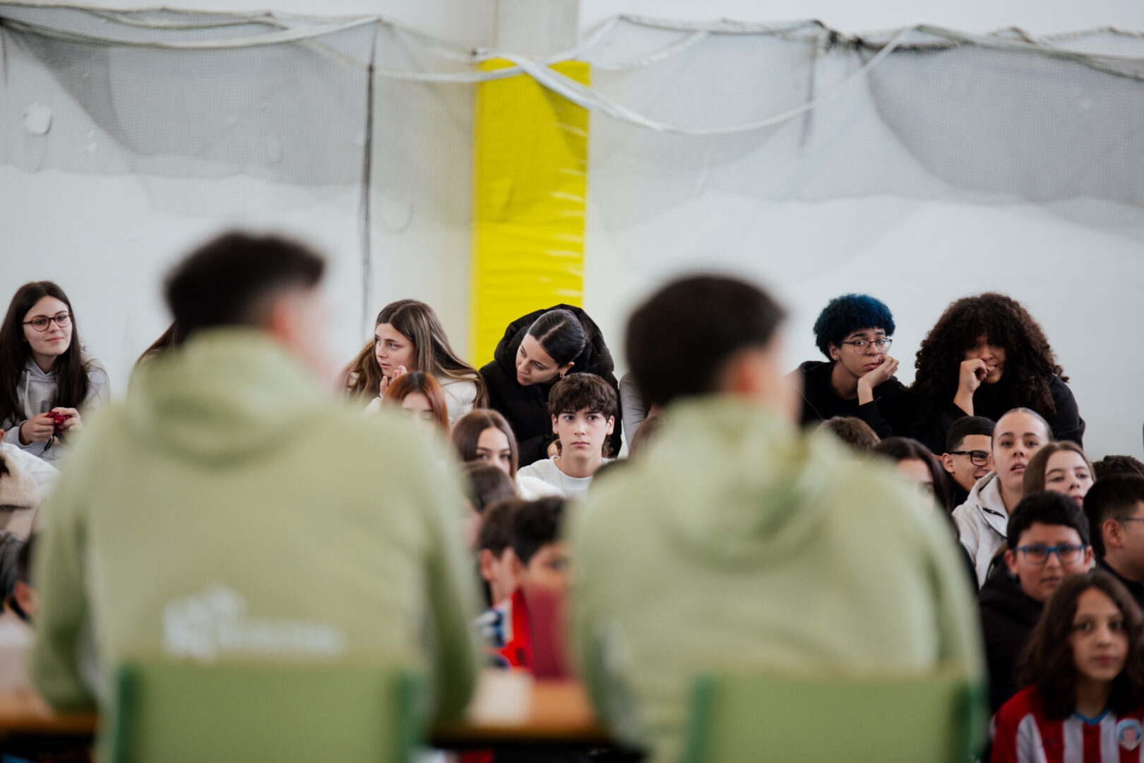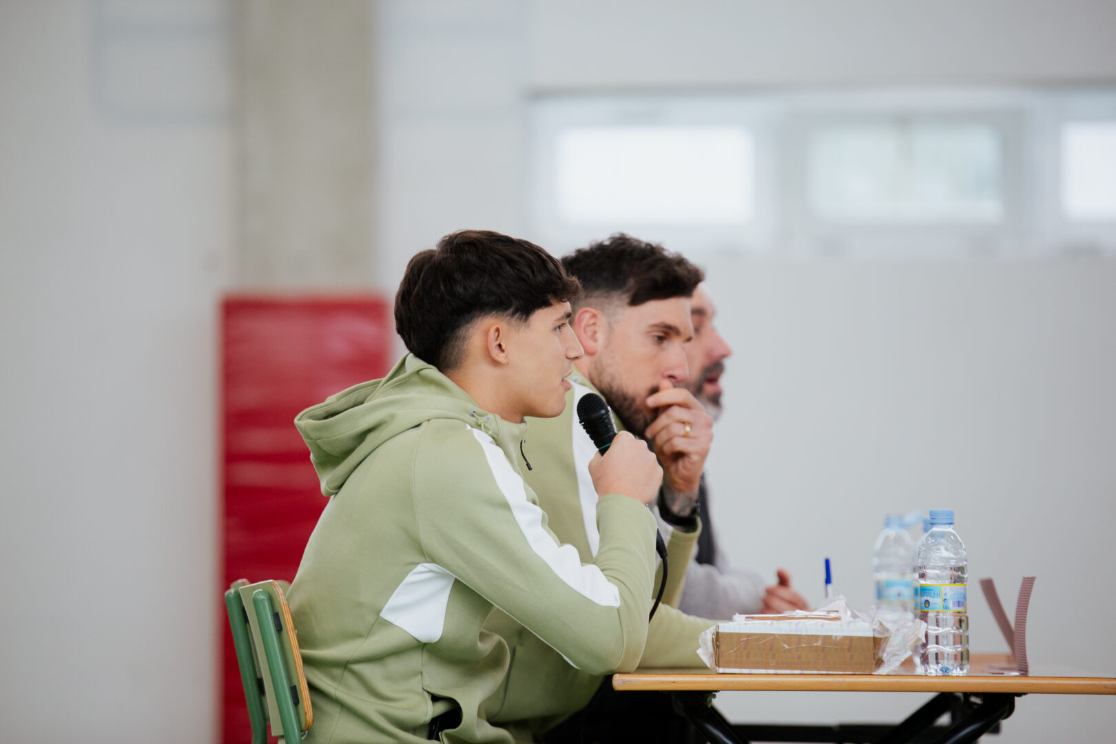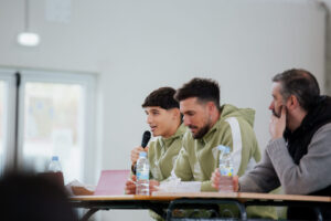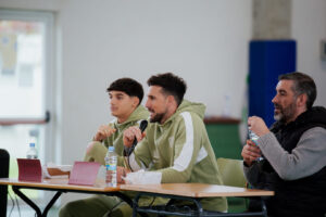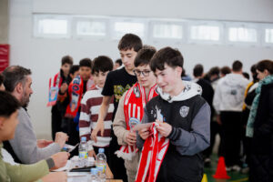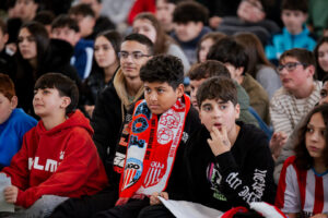 Durante el encuentro, ambos futbolistas participaron en una charla cercana con el alumnado, en la que respondieron a numerosas preguntas y compartieron experiencias, anécdotas y vivencias relacionadas con su trayectoria deportiva y el día a día del fútbol profesional. Un momento que permitió a niños y niñas de distintas edades conocer un poco más de cerca a los jugadores albivermellos.