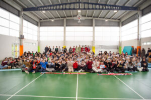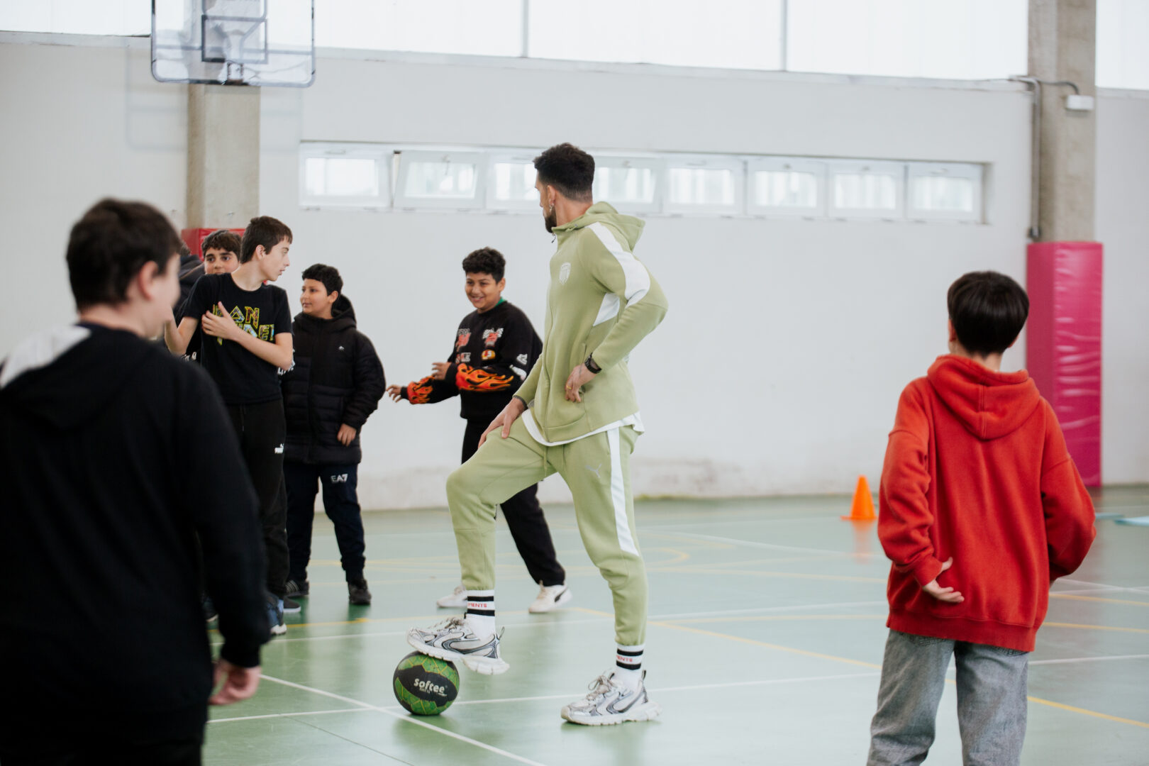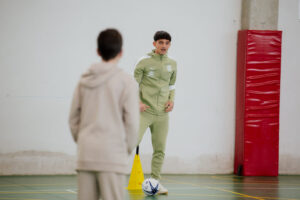 Tras finalizar el reparto de invitaciones y tarjetas, Marc Martínez y Gabriel Costa también tuvieron tiempo para jugar una breve pachanga con algunos de los alumnos y alumnas, que pudieron disfrutar de un momento único compartiendo balón con los jugadores del primer equipo.